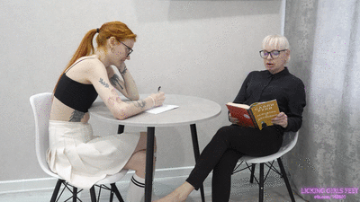 Mistress Lora was reading her book, preparing herself for a lecture that she was about to walk in to when a student walked in and begged her to give her the cat that she did not sit for. She was apparently late to get to class, and she found it locked when she got there. The mistress does not tolerate lateness, and she knows this. The mistress punishes her further by not giving her the paper, and she makes her worship her feet